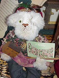 | "To your health, Mates! I'm known as Peter, and while my name may be more closely associated with rabbits and with Easter, I am truly a Christmas Child from my ears to my toes. And speaking of ears, you can see from my picture that I sport a rather unusual characteristic. You see that one ear looks a bit . . . dare I say it . . . odd? Well, Kathy and Julie think it is because I spent the past 10 months on the bottom of a box, with some of my family packed on top of me! |